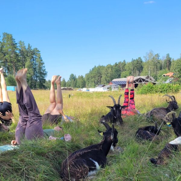 Ett Getyogapass kan se olika ut från gång till gång. Här kombineras rörelse och avslappning med umgänge med djuren. En upplevelse som vi tror kommer göra ett härligt avtryck. Karin anpassar yogan så att alla kan vara med.